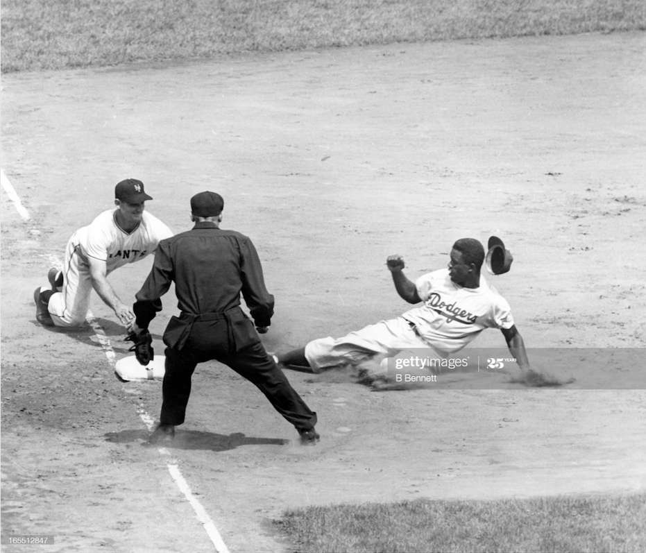 Brooklyn Dodgers v New York Giants: NEW YORK, NY -JULY 2: Jackie Robinson #42 of the Brooklyn Dodgers slides safely into third as Sid Gordon of the New York Giants was late to tag Robinson as home plate umpire Lon Warneke moved up to make the call on July 2, 1949 at the Polo Grounds in New York, New York. (Photo by B Bennett/Getty Images)