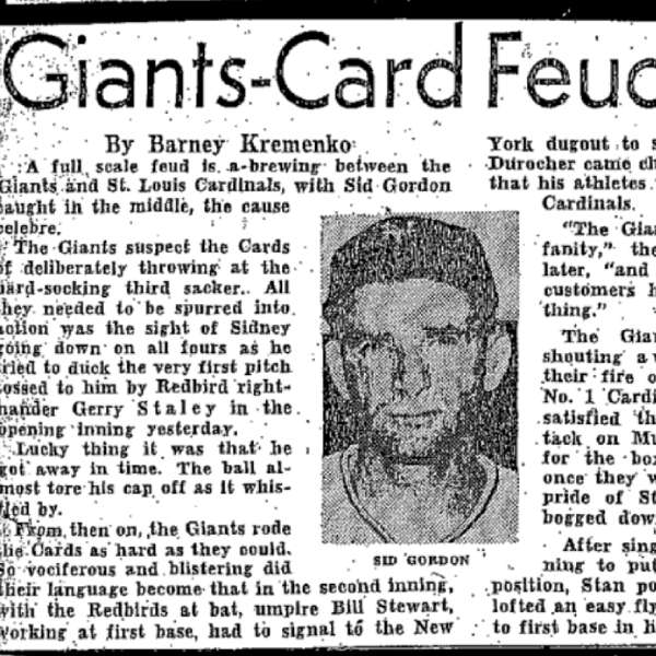 In 1949, Gordon was the target of racial attacks and was also thrown at in alarming numbers. The Cardinals were the worst offenders. Here Barney Kremenko of the New York Journal-American is covering the story. June 9, 1949.