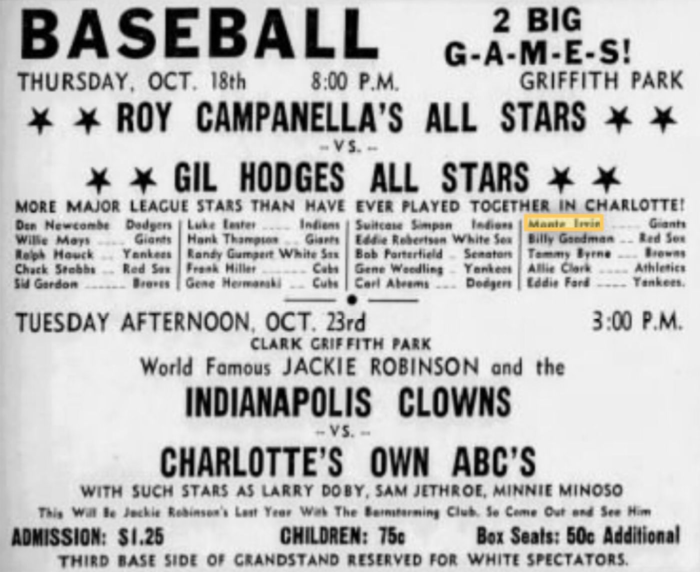 RoyCampanella’s AllStarsvsGilHodges’ AllStars promotional advertisement in October 1951.