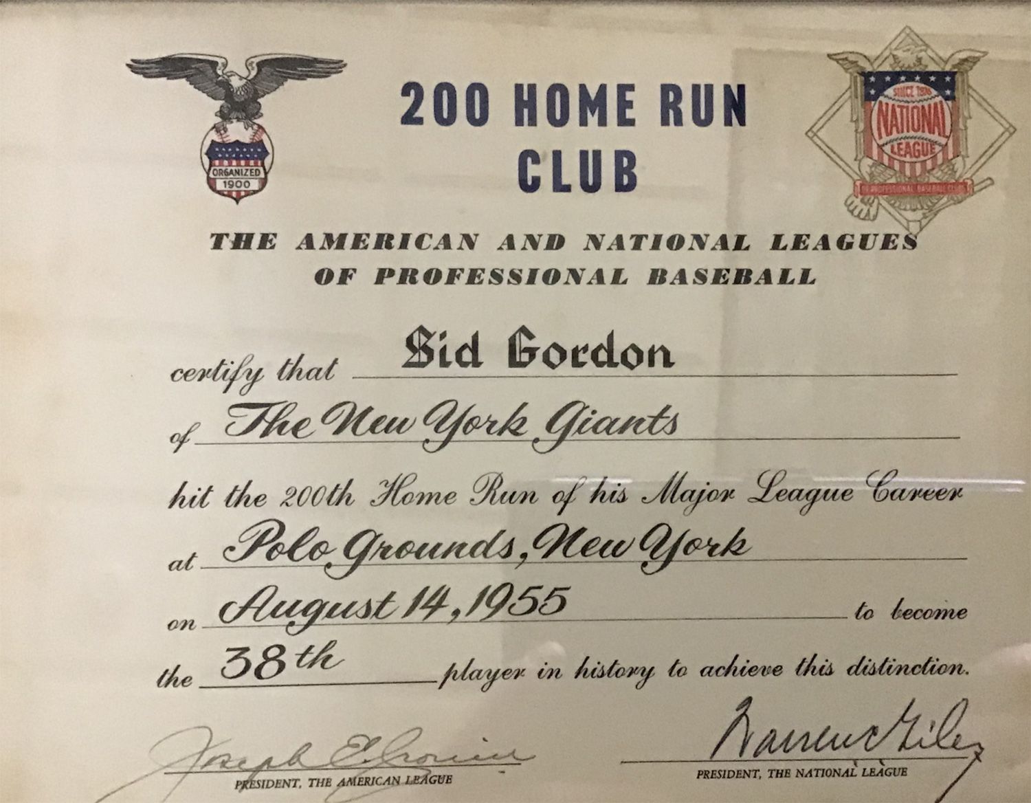 The American League and Nation League presented Sid Gordon the 200 Home Run Club award on August 14, 1955.